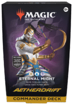 In Commander, four players come together to show their strength and strategy, with one player coming out on top. Each 100-card ready-to-play Aetherdrift Commander Deck makes it easy for Commander fans in your store to grab a deck and play right away.